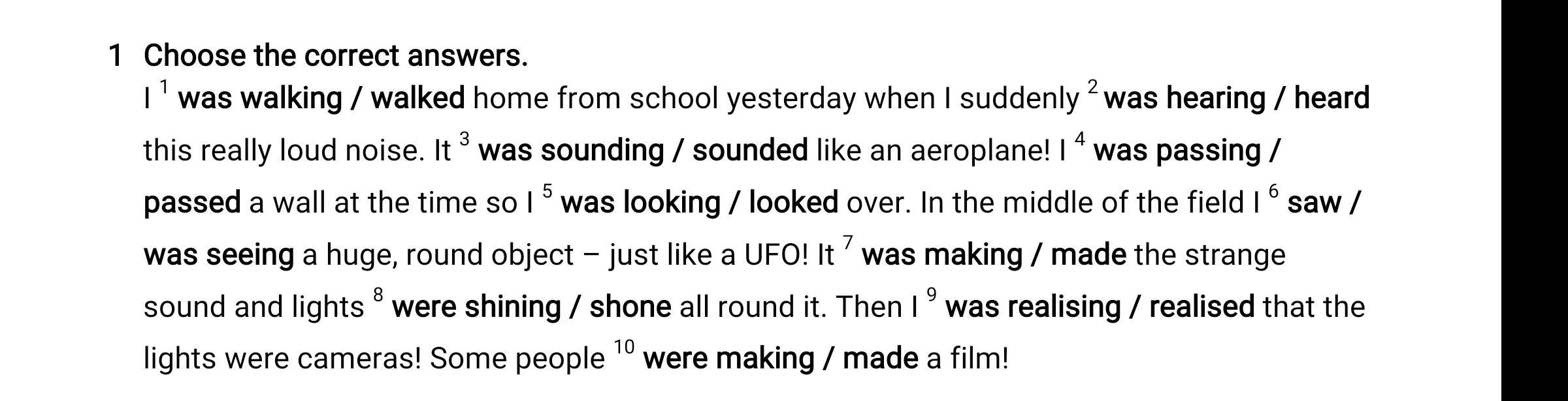 was walking; heard; sounded; was passing; looked; saw; was making; were shining; realised; were making