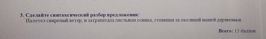 Налетел (глагол) свирепый (прил.) ветер (сущ.), и (союз) затрепетала (глаг.) листьями (сущ.) осинка (сущ.), стоявшая за околицей нашей деревеньки.(причастный оборот)