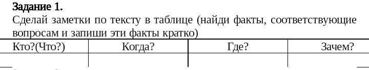 сделай заметки по тексту в таблице (найди факты, соответствующие вопросам и запиши эти факты кратко)