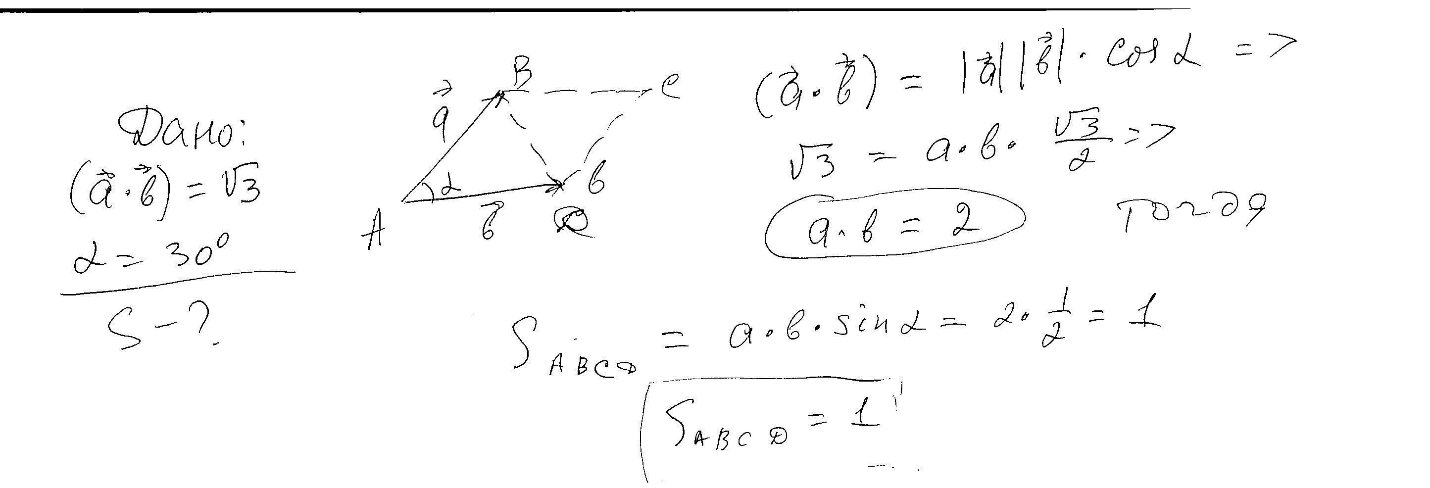 3. Если угол между векторами a и b равен 30 градусам, а скалярное произведение a * b =√ 3 , то какова площадь параллелограмма, построенного этими векторами:
