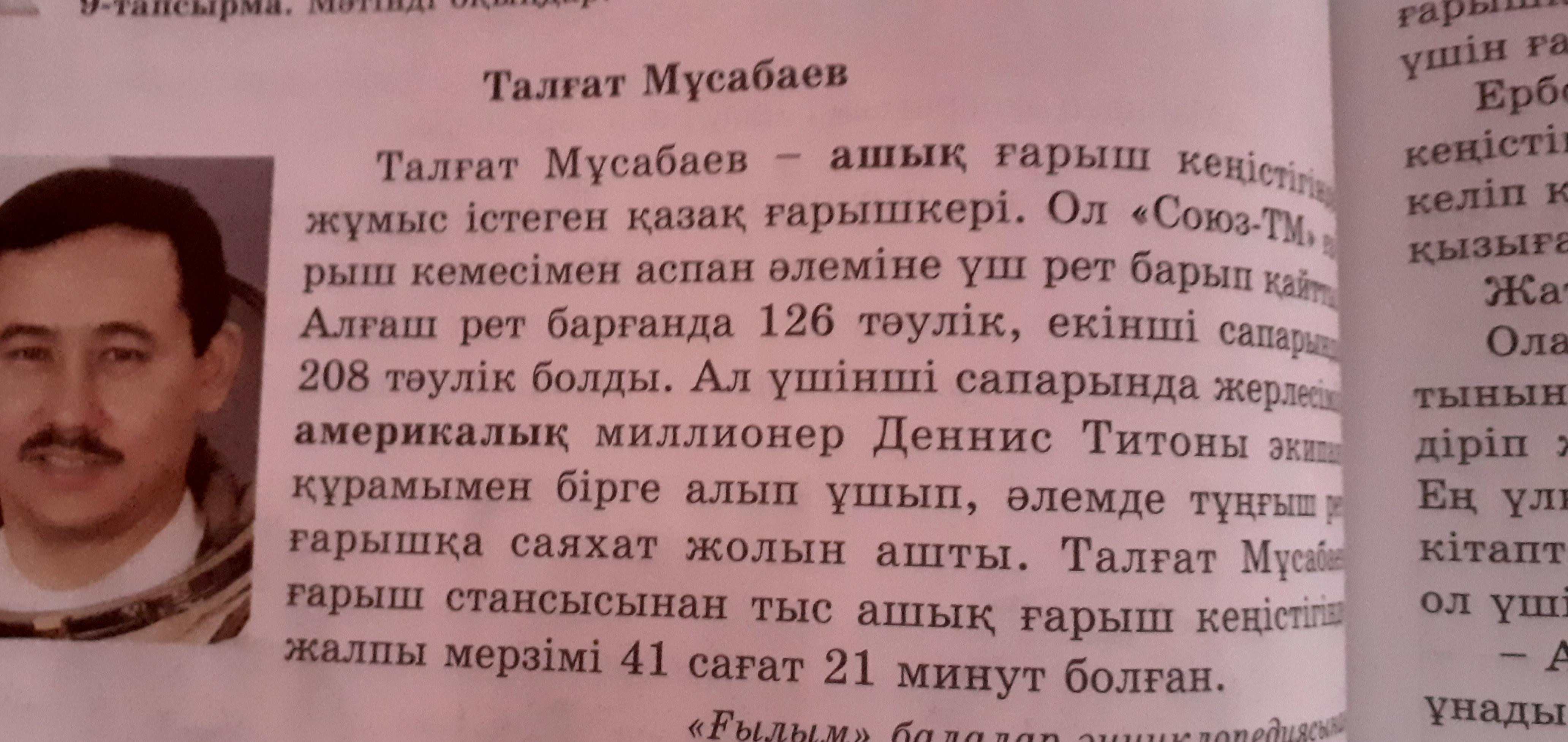 Қазақ елінде алғашқы ғарышкер болып Талғат Мұсабаев есептеледі.Крч дальше лень писать