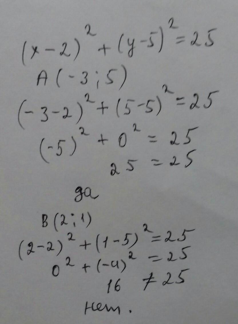принадлежат ли точки А( -3;5),В(2;1) заданной окружности