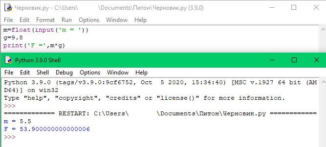 print('сила тяжести при массе тела', m, 'кг', 'равняется =', m * 9.8, 'Н')