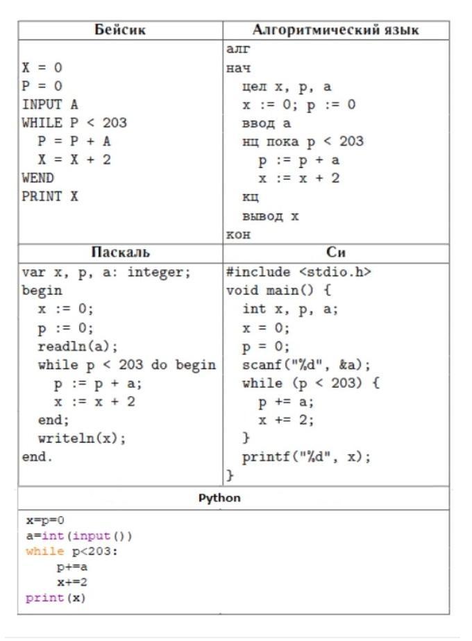 Переменная р каждый раз увеличивается на а, пока не станет больше либо равна 203. Тогда произойдёт выход из цикла, поскольку условие станет False. Мы знаем, что в цикле 8 итераций. Следовательно, на 7-ой итерации условие всё ещё было True, а на 8-ой стало False, тогда:
