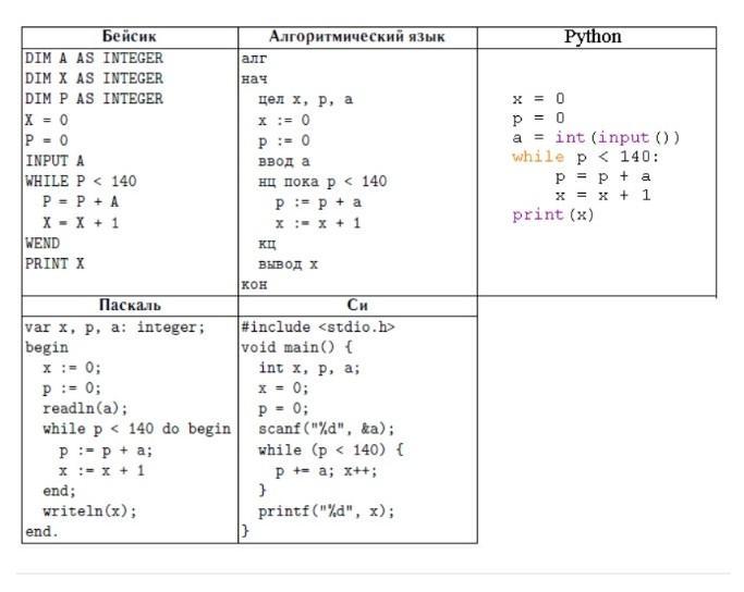 Теперь рассмотрим, как изменялось значение переменной p. Начальное значение p = 0. На каждой итерации цикла значение переменной p увеличивается на a. Так как всего было выполнено 47 итераций, то после выполнения цикла p = 0 + 47 · a = 47a. Так как цикл выполняется, пока условие p < 140 истинно, то выход из цикла осуществляется при p > 140.