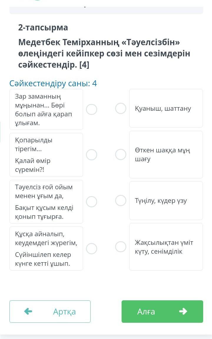 медетьек темірханның тәуелсізбің өленініңдегі кейіпкер сөзі мен сезімдерін сәйкестіріңіз