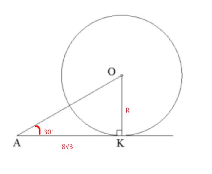 tg30°=ОК/АК ⇒ √3/3 = ОК/8√3 ⇒ ОК = (√3*8√3)/3