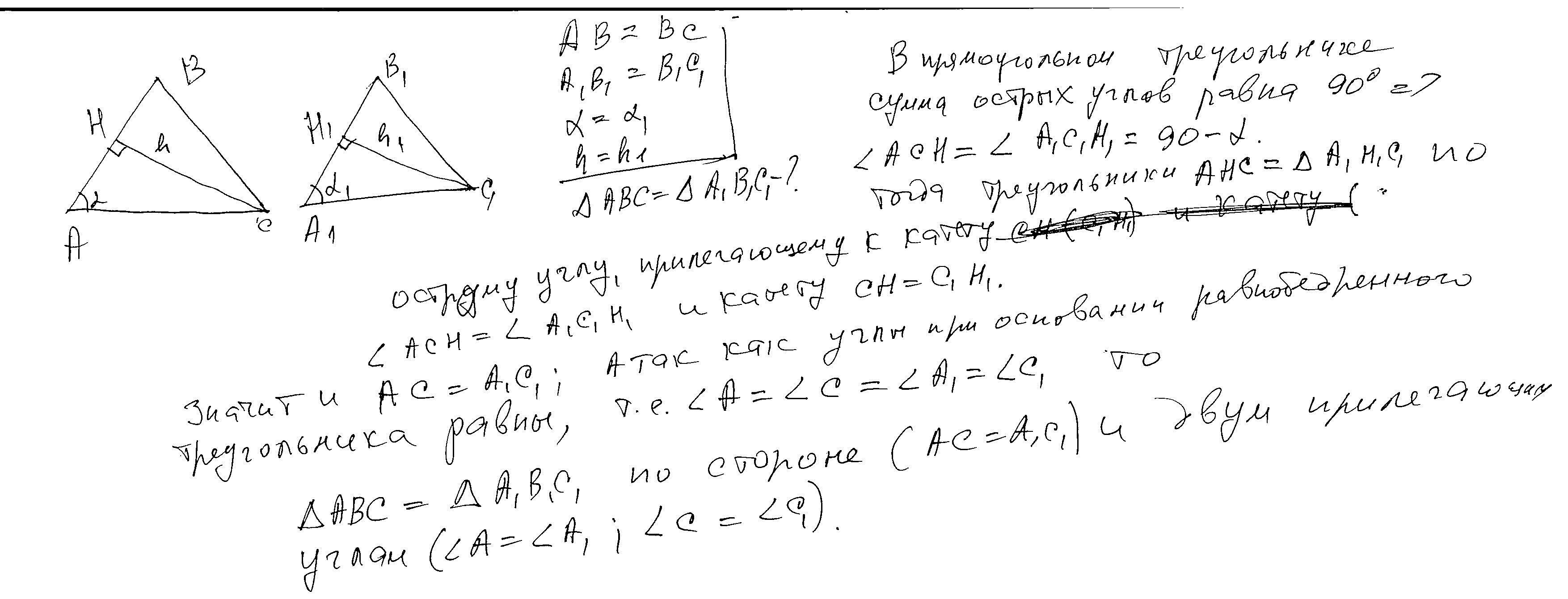 Докажите равенство двух равнобедренных треугольников по углу при основании и высоте, проведённой к боковой стороне. Даю 45 баллов