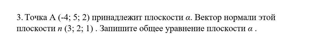 Подставим координаты точки A(–4; 5; 2) и нормали n(3; 2; 1) и приведем полученное выражение к виду общего уравнения плоскости: