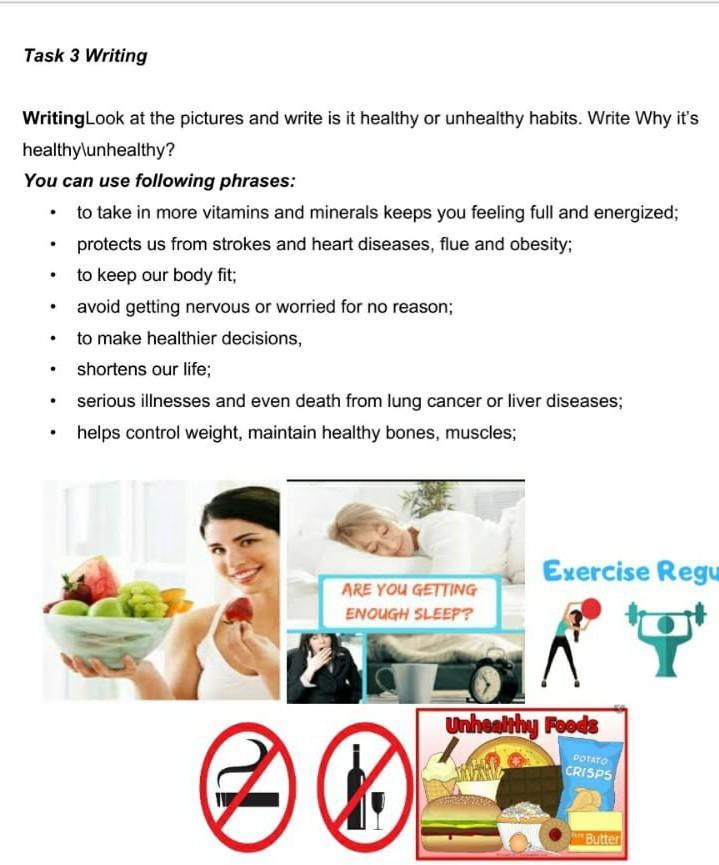 Look at the pictures and write is it healthy or unhealthy habits.Write Why it's healthy/unhealthy?
