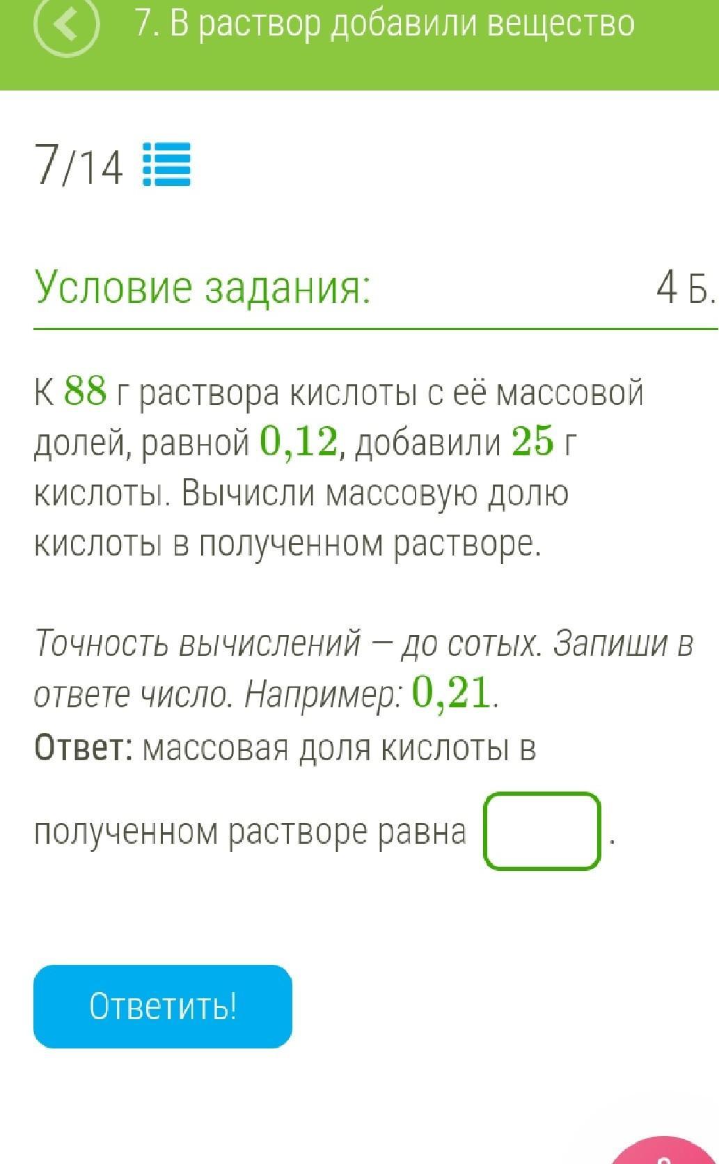 К 88 г раствора кислоты с её массовой долей, равной 0,12, добавили 25 г кислоты. Вычисли массовую долю кислоты в полученном растворе.