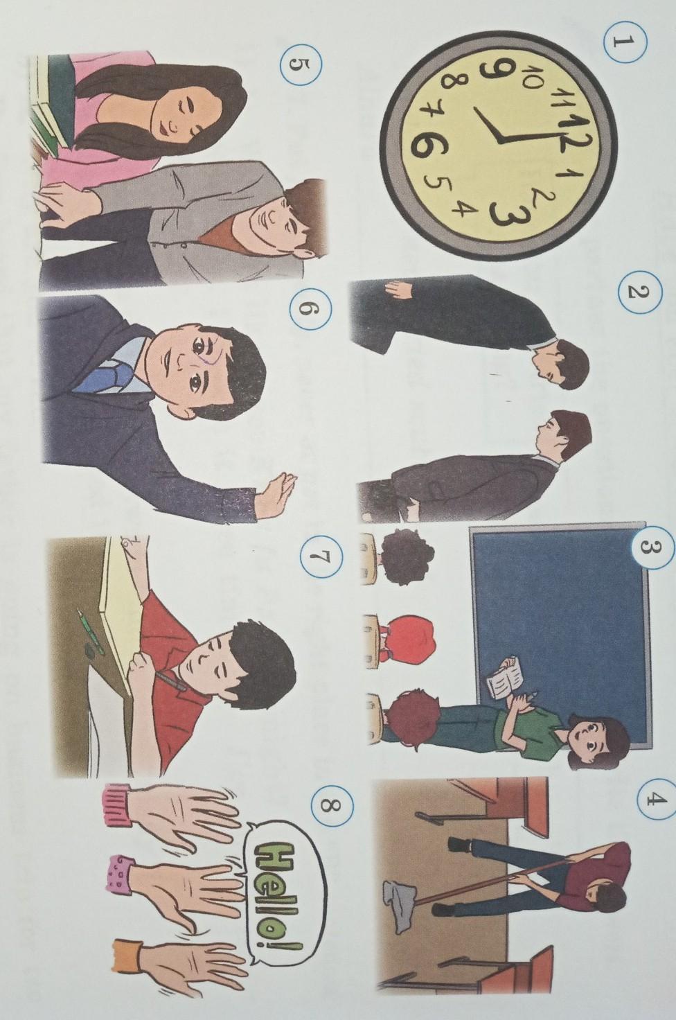 1. a) Match the sentences to the pictures. a) Listen to the teacher. →→ Picture 3 b) Come to class on time. c) Raise your hand. d) Be polite. e) Keep the school clean. f) Do your homework. g) Greet your teachers and classmates. сопоставить предложения с картинами;