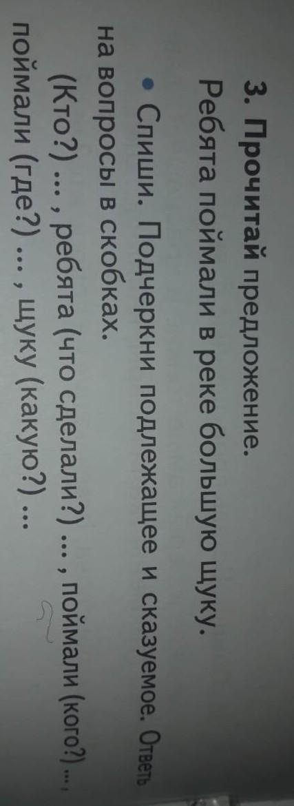 3. Прочитай предложение. Ребята поймали в реке большую щуку. . Спиши. Подчеркни подлежащее и сказуемое. Ответь на вопросы в скобках. (Кто?) ... , .., поймали (кого?).. поймали (где?) ... , щуку (какую?) ... ребята (что сделали?) .