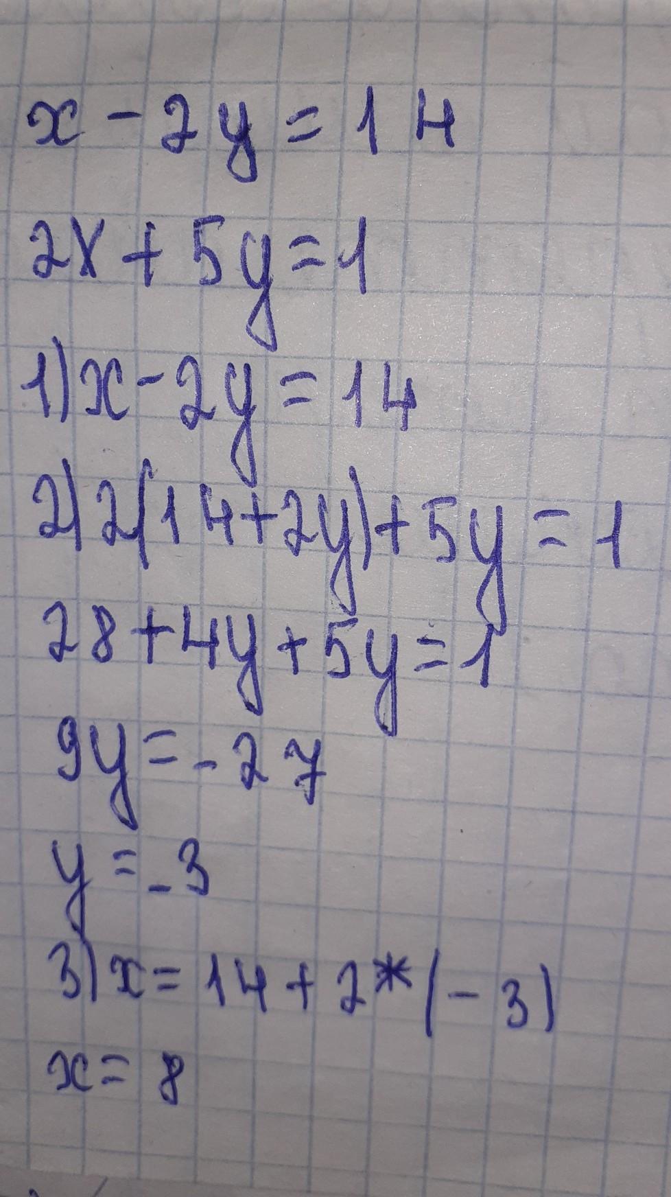 Розв'язати систему рівняннь способом підстановки {x - 2y = 4, {2x + 5y = 1
