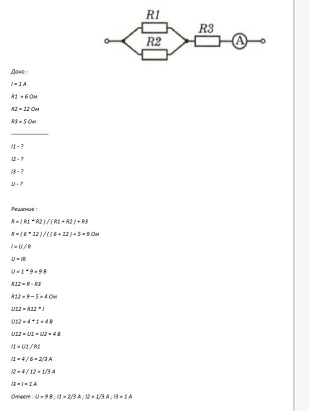 Найдите силу тока в каждом из резисторов и приложенное к цепи напряжение, если амперметр показывает силу тока 1А. сопротивление резисторов R1=6 Ом R2= 12 Ом R3= 5 Ом