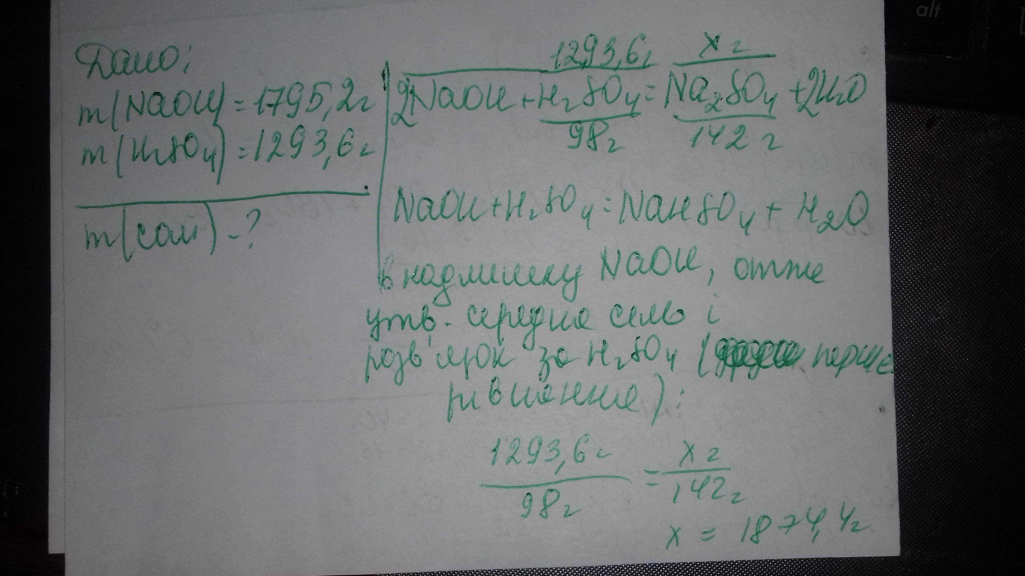 Натрій гідроксид масою 1795,2 г змішали з 1293,6 г сульфатної кислоти. Запиши масу солі, яка утворилася: