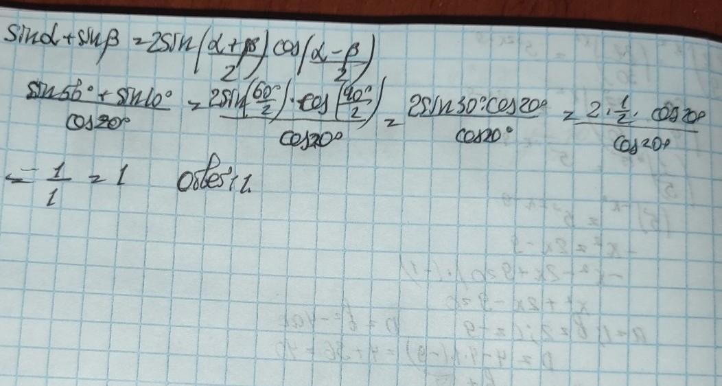 2sin30*cos20/cos20=2sin30=2*1/2=1