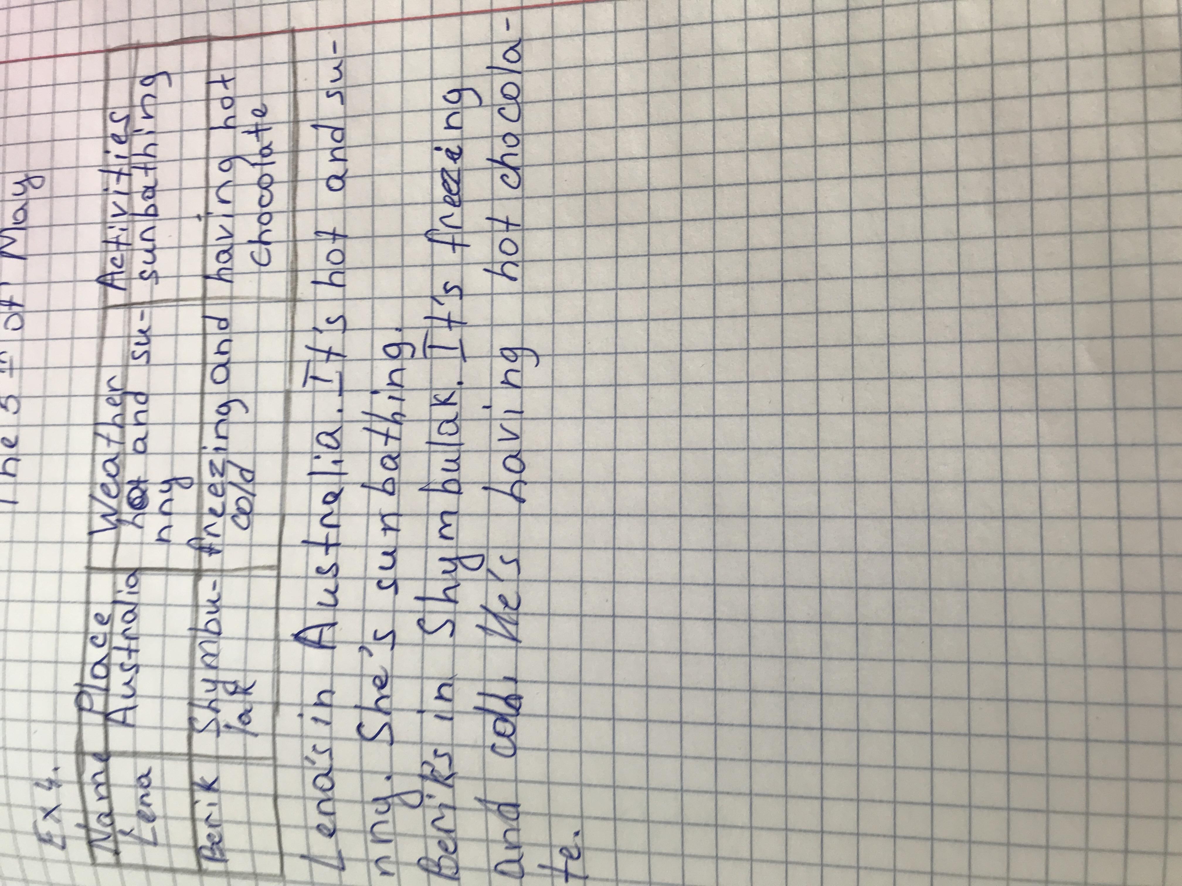 5.56 Copy and complete the table. Talk about each person to the class. Name Place Ruslan Thailand Weather Activities warm/ sunny have a snack Ruslan's in Thailand. It's warm and sunny today. He's having a snack now with Nurzhan.
