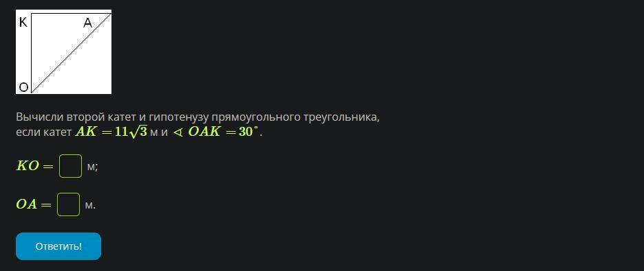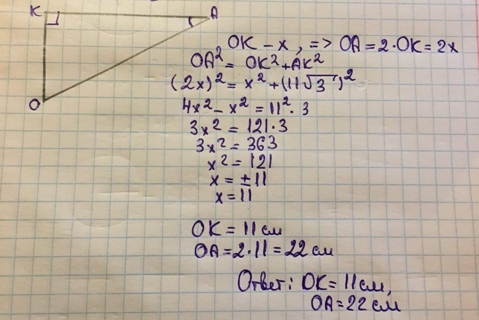 если катет AK= 11√3 м и ∢ OAK= 30°.