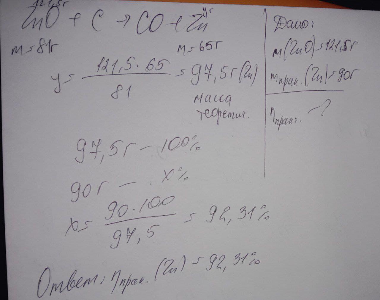 В результате восстановления углем оксида цинка массой 121,5г получили цинк массой 90г. Рассчитайте практический выход (%) металла