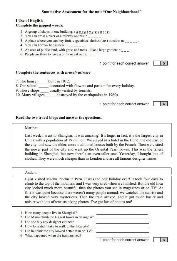 Summative Аssessment for the unit “Our Neighbourhood”