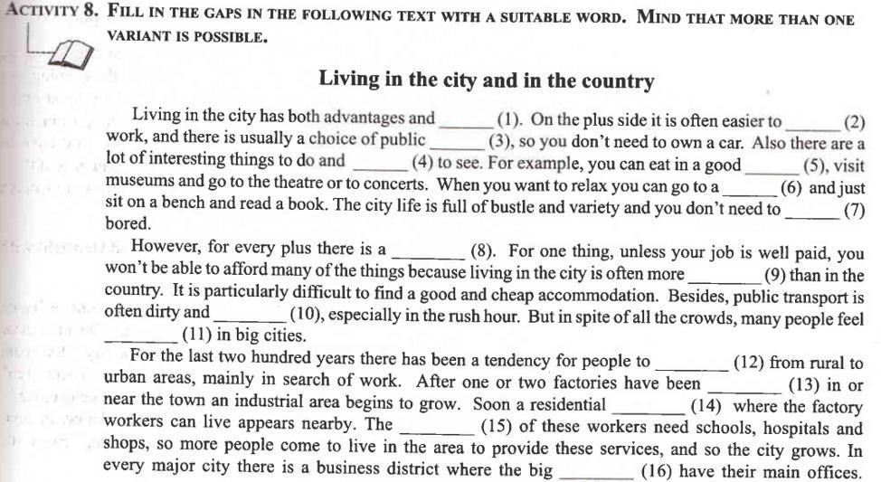 Ответ:1. Disadvantages, 2. Get 3. Transport 4.things 5. restaraunt 6. Park 7.feel 8. Minus 9. Expensive 10. Overcrowded 11. Nice 12. Move 13. Built 14. Houses 15. Majority 16. Companies 17. Buildings 18. Luggage 19. Are continuing 20. Country