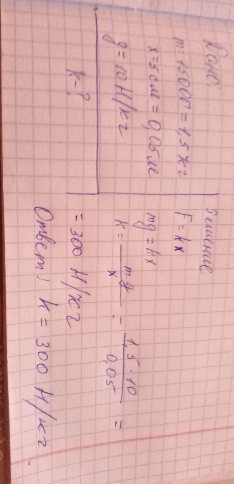 К пружине подвесили груз массой 1500г, при этом она растянулась на 5 см.