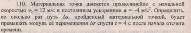 Материальная точка движение прямолинейно с начальной скоростью v0 = 12 м/с и постоянным ускорением a= -4м/с2. Определить, во сколько раз путь ∆s, пройденный материальной точкой, будет превышать модуль её перемещения ∆r спустя t = 4 с после начала отчета времени