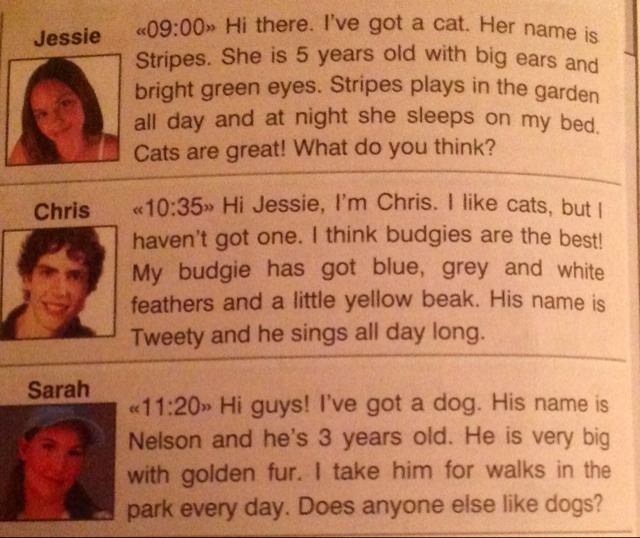 2) привет Джеси, я Крис. я люблю котов, но у меня нет ни одного. я думаю, волнистые попугайчики самые лучшие! у моих попугайчиков голубые, серые и белые перья, и маленький желтый клюв. его имя Твити и он поет весь день напролет.