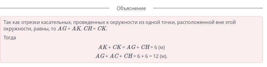 художник для оформления стены комнаты вписал круг в прямоугольный треугольник АВС.Окружность касается катета АВ в точке G катета СВ в точке Н а гипотенузы в точке К.Сколько метров декоративной ленты потребуется художнику для оформления отрезков АG ,АС и СН,если длина диагонали стены АС=6м.АG+АС+СН=?