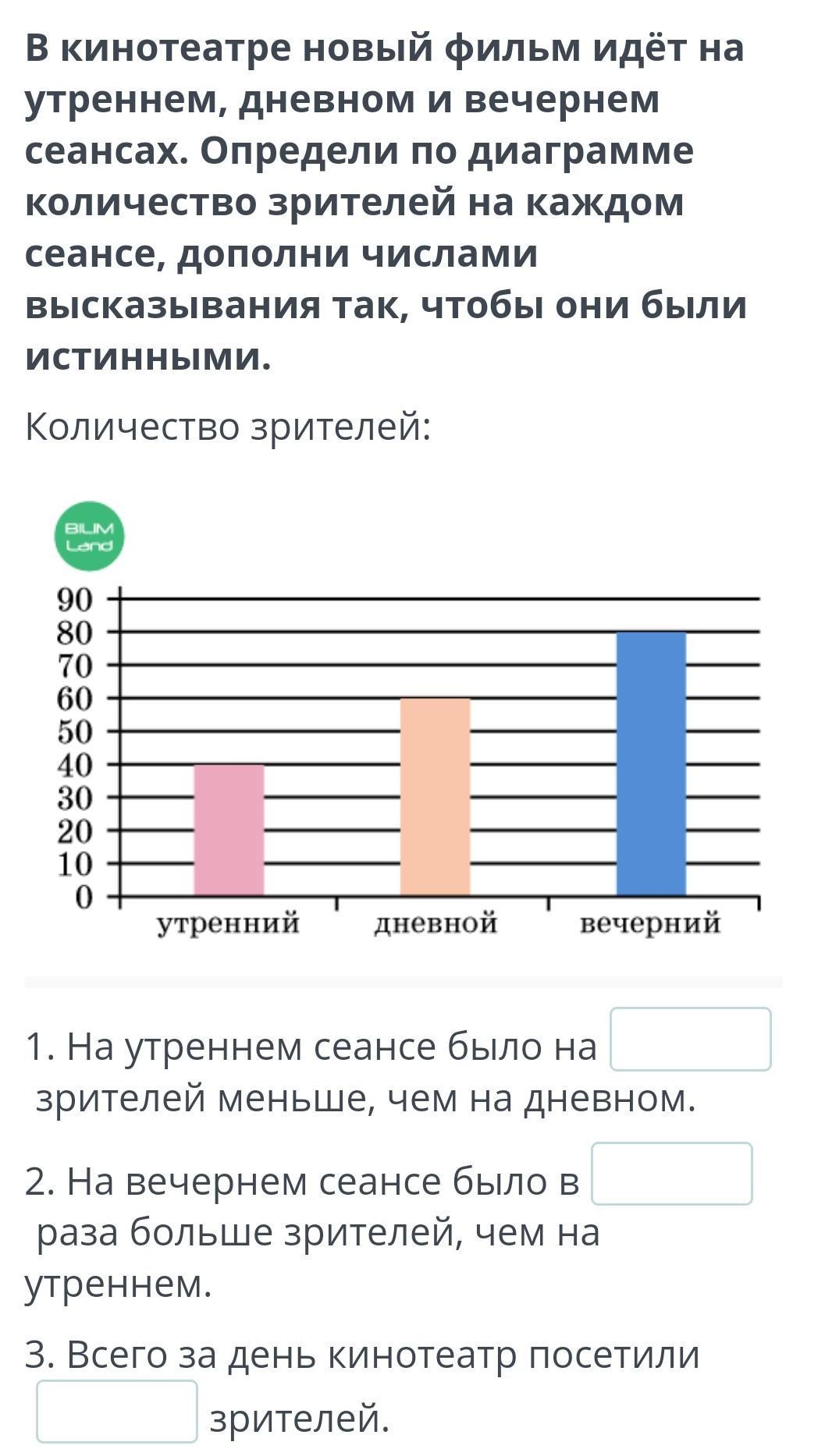 В кинотеатре новый фильм идёт на утреннем, дневном и вечернем сеансах. Определи по диаграмме количество зрителей на каждом сеансе, дополни числами высказывания так, чтобы они были истинными.