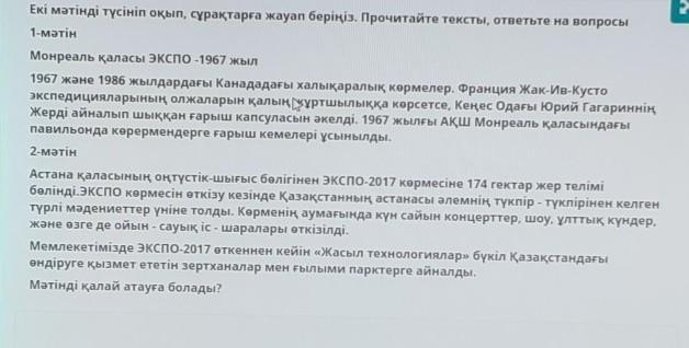 2)Айырмашылығы-1-мәтін:Канададағы халқаралық көрме жайында айтылған. 2-мәтін: ЭКСПО-2017 көрмесі жайында айтылған