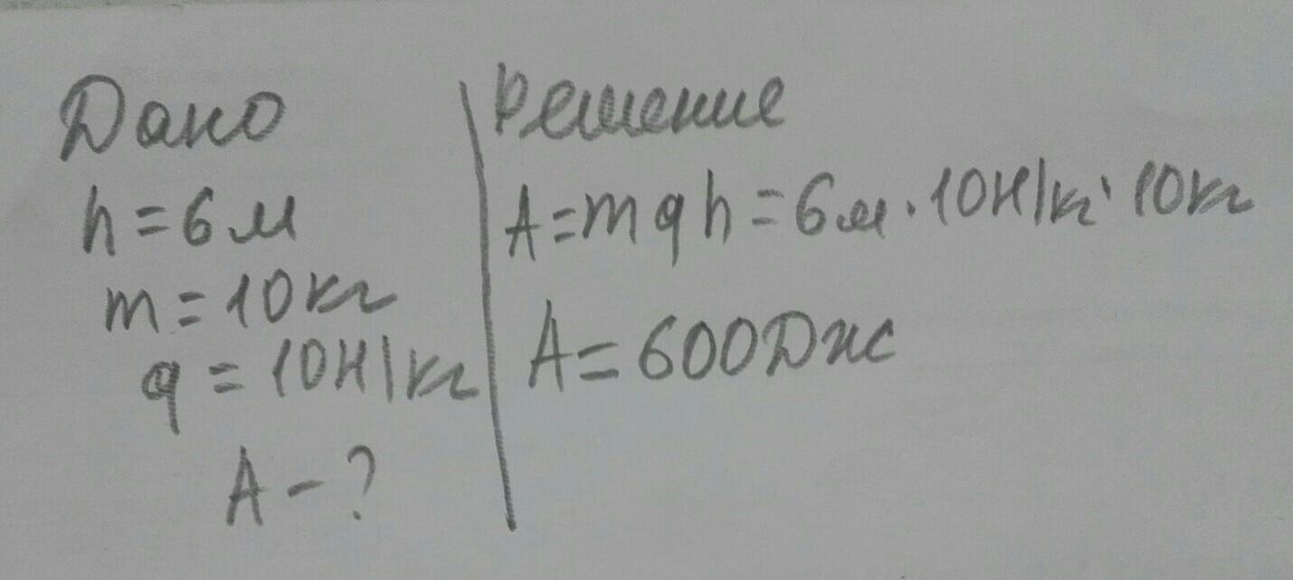 Вычислите количество проделанной работы (в Джоулях) при процессе поднятия ведра из колодца. При этом глубина данного колодца состовялет 6 метров, а масса заданного ведра равна 10 кг.