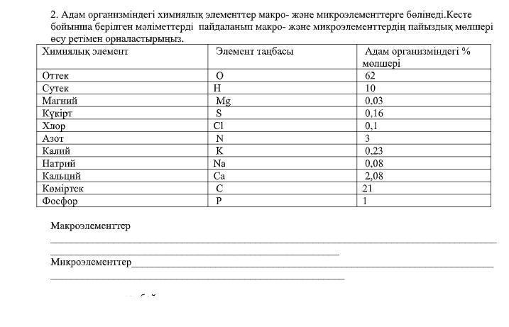 2. Химические элементы в организме человека делятся на макро- и микроэлементы.Процент макро- и микроэлементов с использованием данных, представленных на Расположите в порядке возрастания.