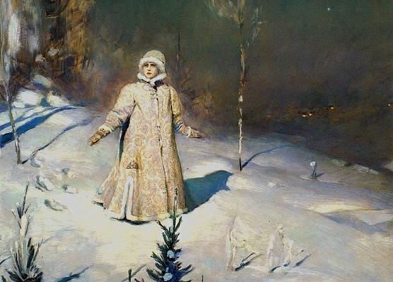 В)Васнецов в своей картине попытался подчеркнуть, что Снегурочка сама является снежной. Она одета во всё белое. На ней красивая длинная меховая шуба, расшитая узорами, головной убор. Васнецов попытался поймать тот момент, когда девушка только-только вышла из леса на опушку и встала в растерянности. Её лицо чуть испуганное, руки расставлены в стороны. Кажется, ещё чуть-чуть и она повернёт обратно, так необычно для неё то, что она делает.