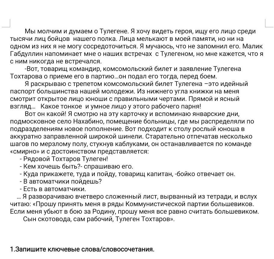 Тулеген; герой; бойцы; полк; Малик Габдулин; командир; комсомольский билет; идейный паспорт; рабочий парень; село Нахабино; больница; автоматчики; большевики; Родина.