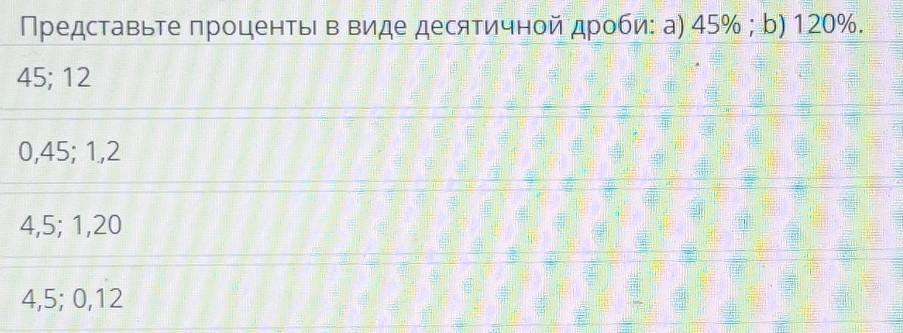 Представьте проценты в виде десятичной дроби: а) 45%; b) 120%.