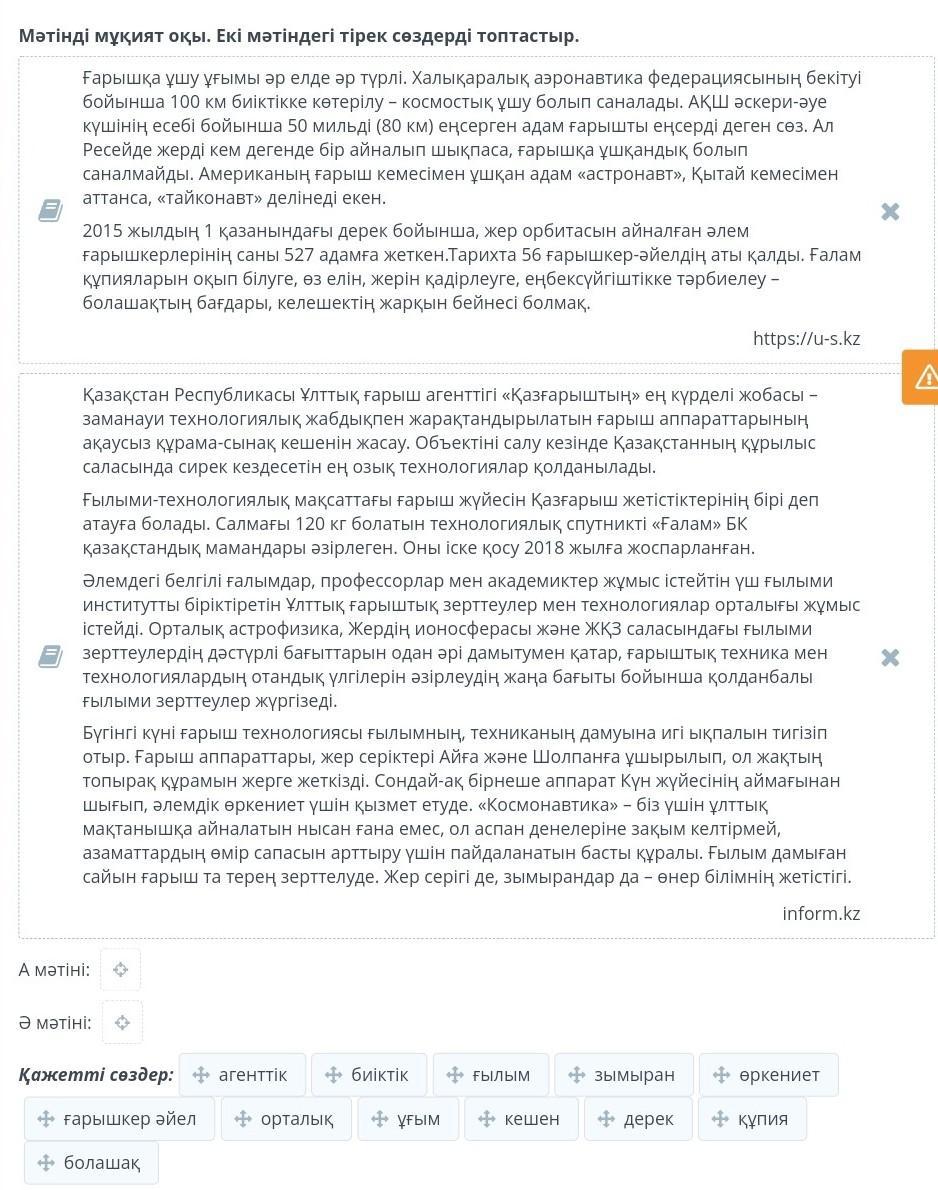 А) мәтін:ғарышкер әйел, биіктік, дерек, кешен.
