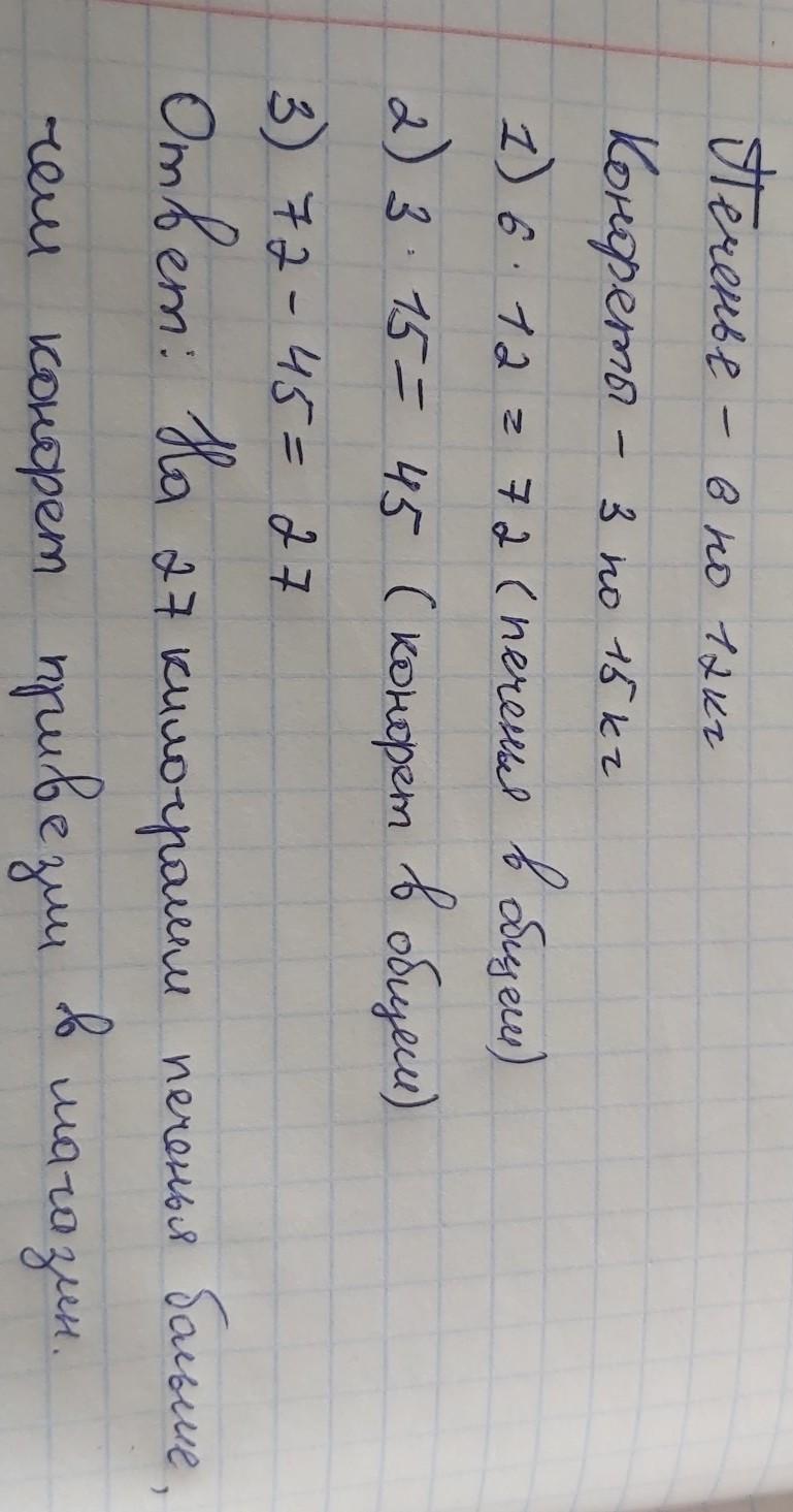 В магазин привезли 6 коробок печенья по 12 кг в каждой и 3 коробки конфет