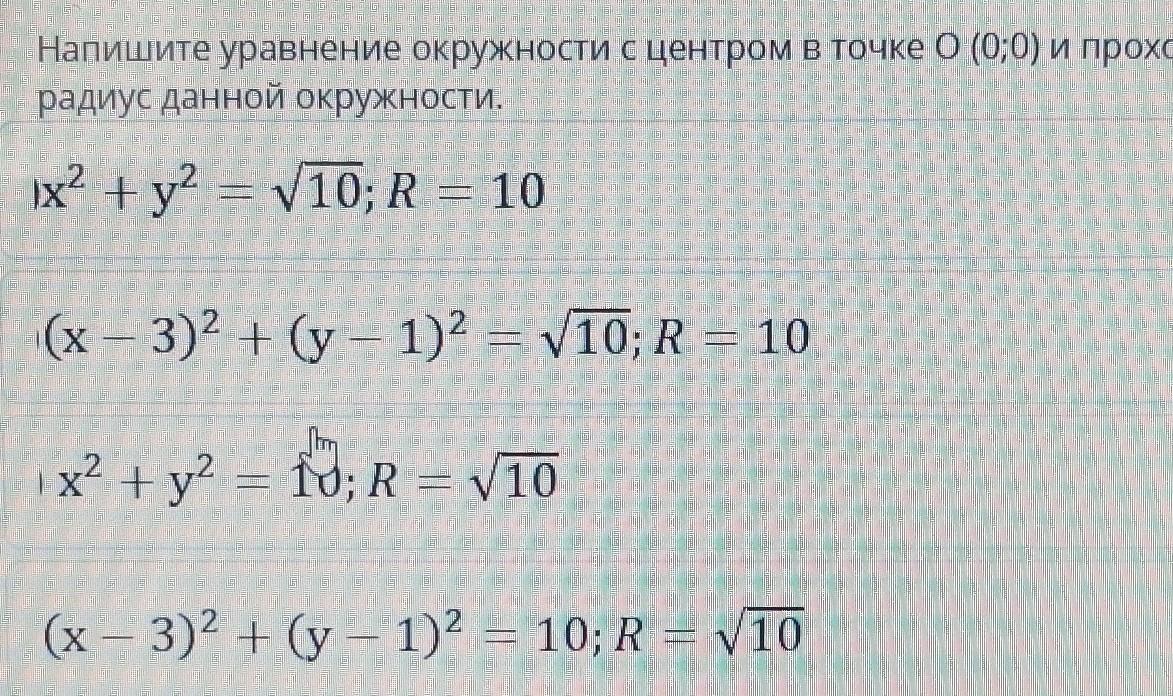 Напишите уравнение окружности с центром в точке 0 (0:0) и проходящей через точку В(3;1). Чему равен