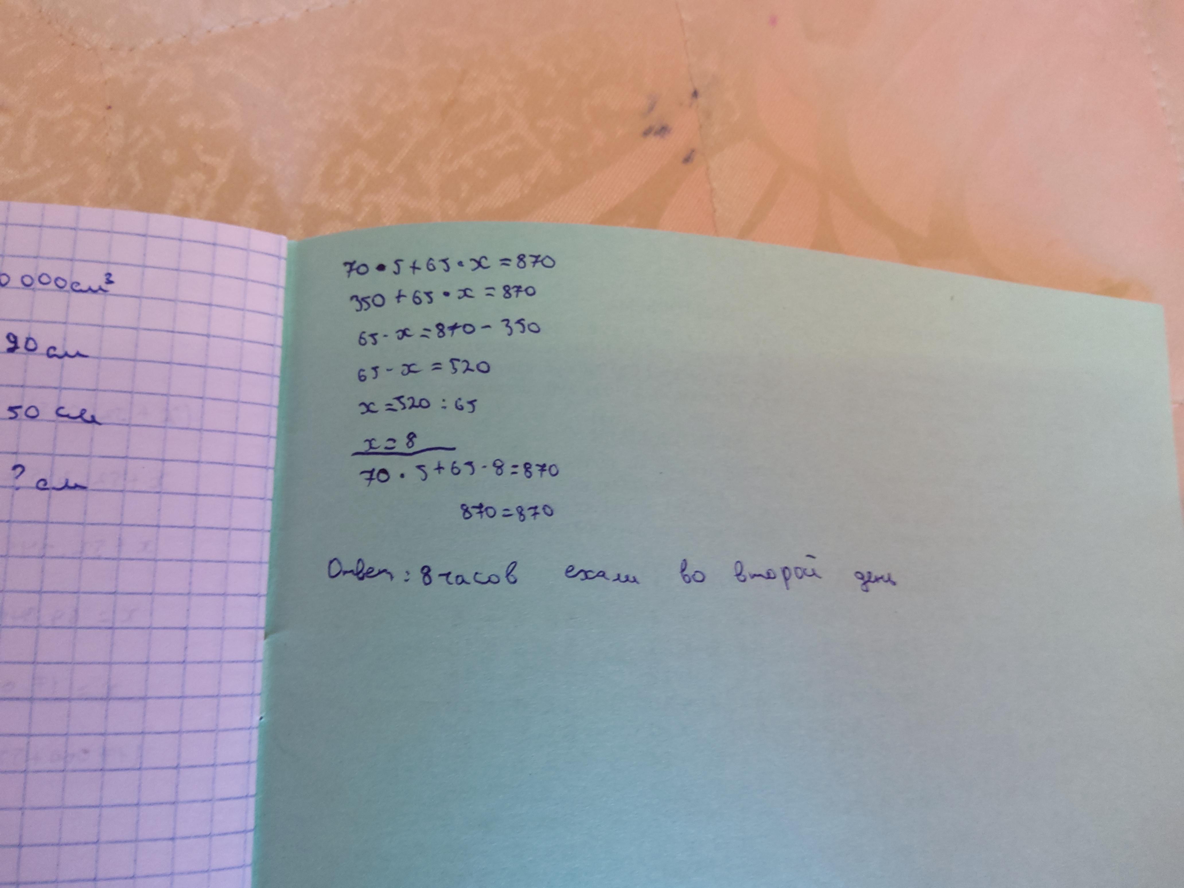 я могу составить уравнение по задаче Реши задачу с помощью уравнения автотуристы в первый день ехал со скоростью 70 км ч 5:00 а во второй день несколько часов со скоростью 65 км ч всего они проехали 870 км ч Сколько часов ехал туристы во второй день