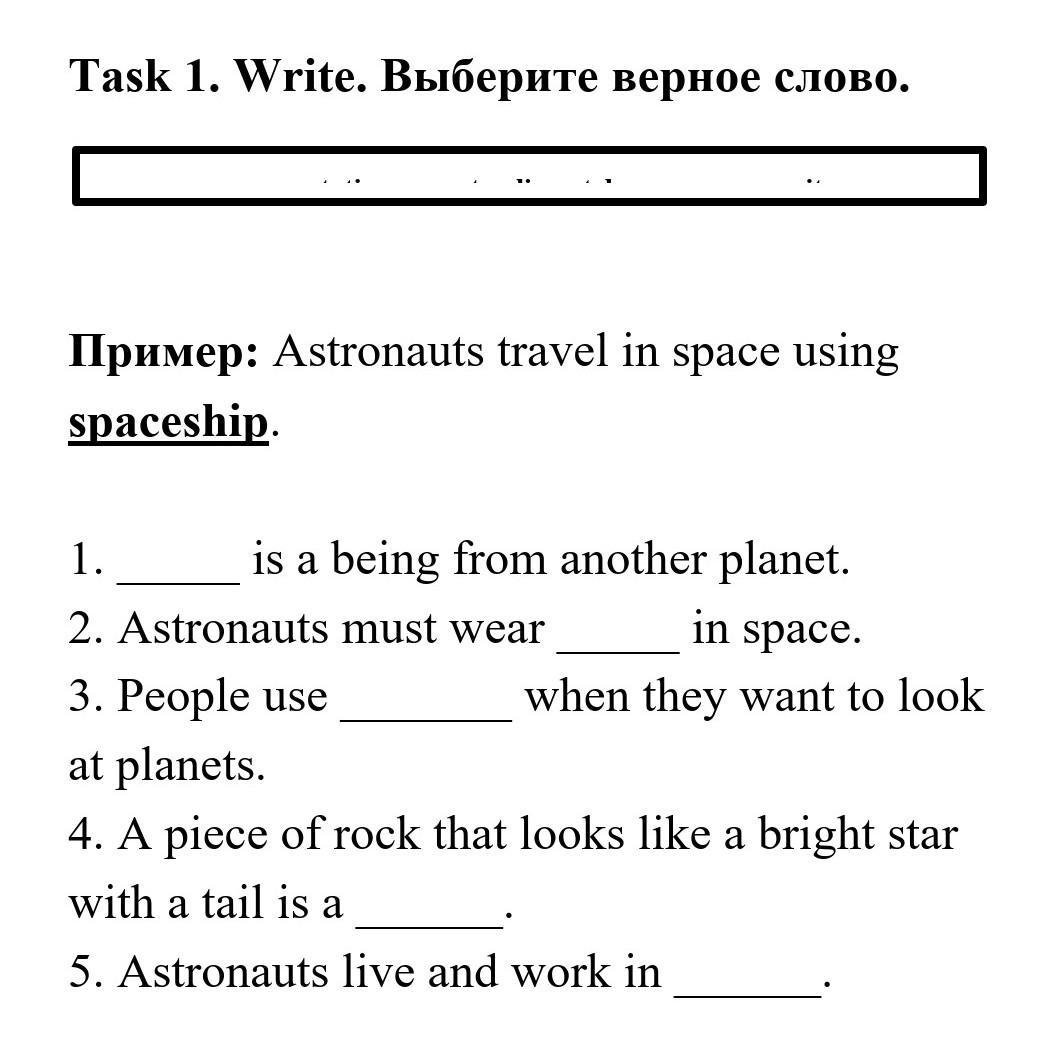 1 an alien 2 a spacesuit 3 a telescope 4 a comet 5 a space station