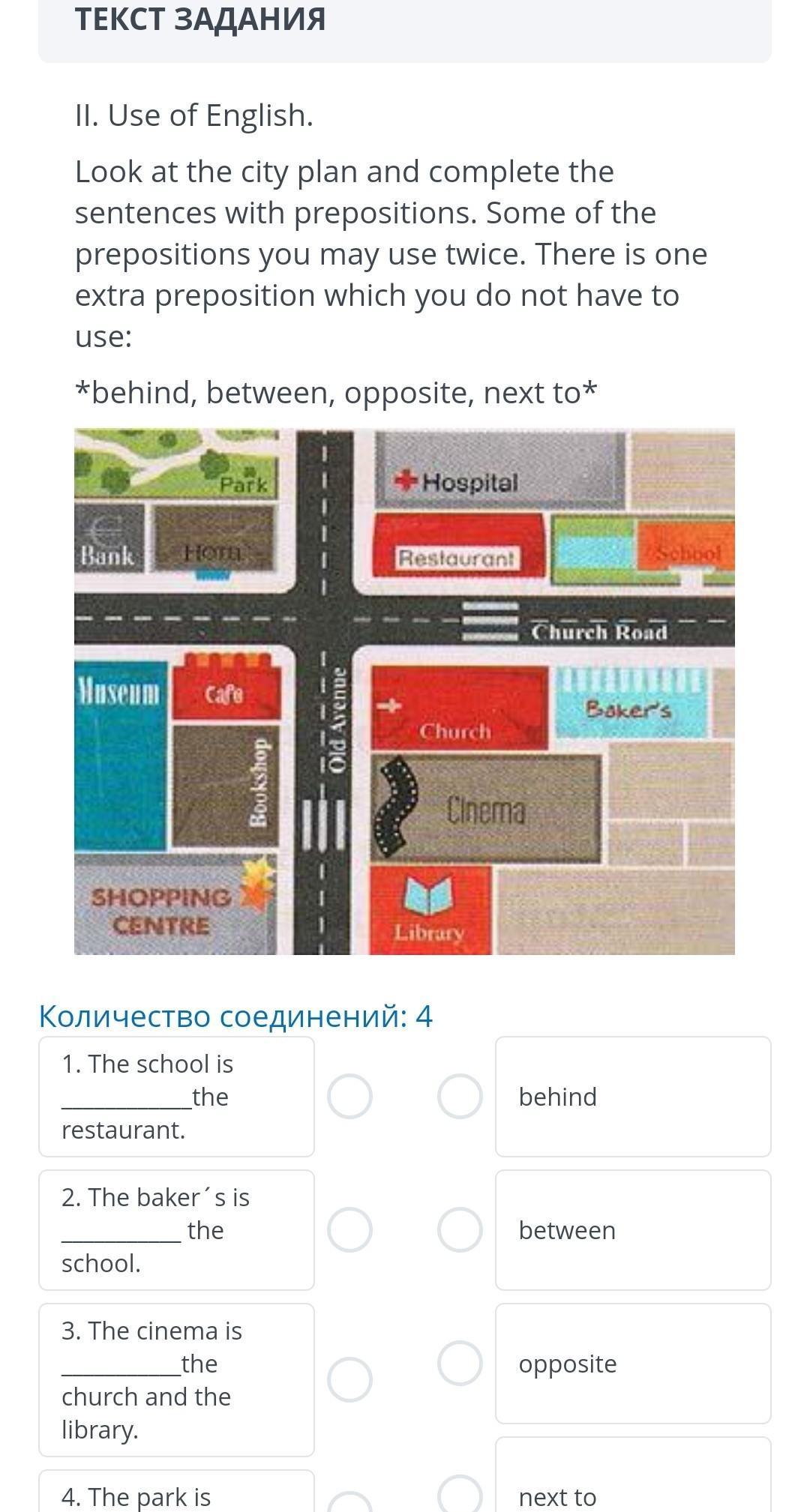 Look at the city plan and complete the sentences with prepositions. Some of the prepositions you may use twice. There is one extra preposition which you do not have to use: