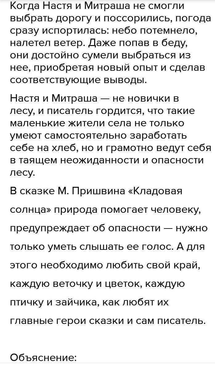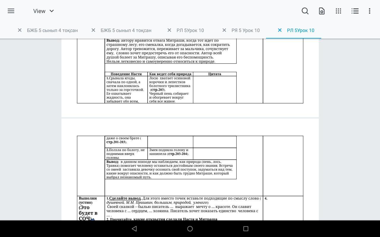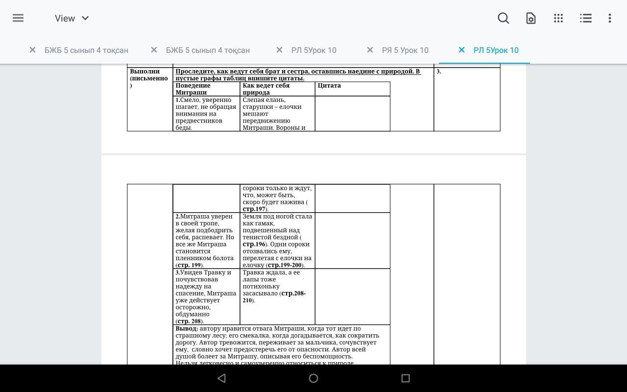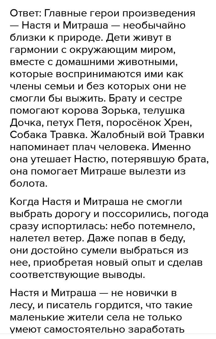 Проследите, как ведут себя брат и сестра, оставшись наедине с природой. В пустые графы таблиц впишите цитаты. Поведение Митраши Как ведет себя природа 1.Смело, уверенно шагает, не обращая внимания на предвестников беды. Слепая елань, старушки – елочки мешают передвижению Митраши. Вороны и Цитата Выполнение 1.Отмечается: + или – понял/ не понял материал 2. 3.сороки только и ждут, что, может быть, скоро будет нажива ( стр.197). 2.Митраша уверен в своей тропе, желая подбодрить себя, распевает. Но все же Митраша становится пленником болота (стр. 199). 3.Увидев Травку и почувствовав надежду на спасение, Митраша уже действует осторожно, обдуманно (стр. 208). Земля под ногой стала как гамак, подвешенный над тенистой бездной ( стр.196). Одни сороки отозвались ему, перелетая с елочки на елочку (стр.199-200). Травка ждала, а ее лапы тоже потихоньку засасывало (стр.208210). Вывод: автору нравится отвага Митраши, когда тот идет по страшному лесу; его смекалка, когда догадывается, как сократить дорогу. Автор тревожится, переживает за мальчика, сочувствует ему, словно хочет предостеречь его от опасности. Автор всей душой болеет за Митрашу, описывая его беспомощность. Нельзя легковесно и самоуверенно относиться к природе. Поведение Насти 1.Срывала ягоды, сначала по одной, а затем наклонялась только за горсточкой. Ее охватывает жадность, она забывает обо всем, Как ведет себя природа Лосю хватает осиновой корочки и лепестков болотного трилистника (стр.203). Черный пень собирает и обогревает вокруг себя все живое. Цитата. ПОМОГИТЕ ОЧЕНЬ ПРОШУ ОЧЕНЬ СРОЧНО НУЖНО!!!!!