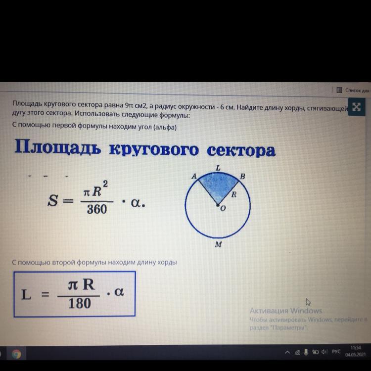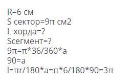 Площадь кругового сектора равна 9т см2, а радиус окружности - 6 см. Найдите длину хорды, стягивающей