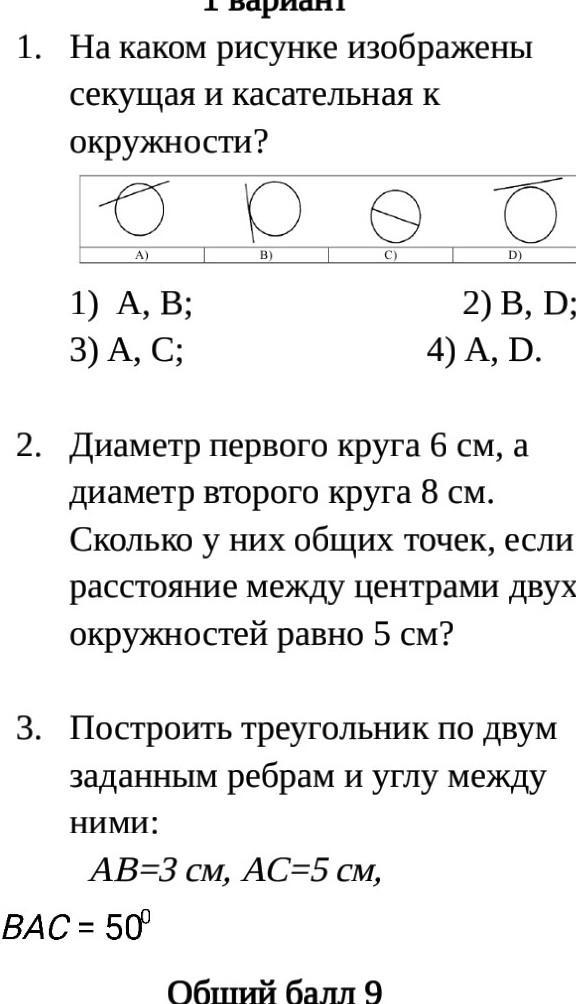 Диаметр первого круга 6 см, а диаметр второго круга 8 см. Сколько у них общих точек, если расстояние между центрами двух окружностей равно 5 см?