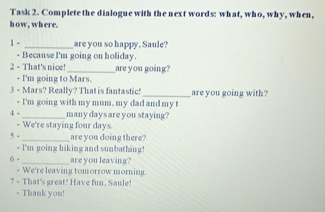 Task 2. Complete the dialogue with the next words: what, who, why, when,