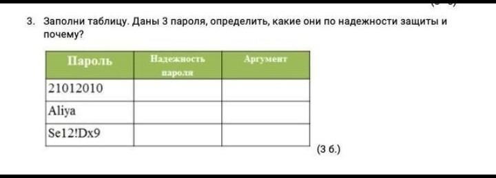 3. Заполните таблицу. Исходя из пароля, определите, какие они есть с точки зрения надежности защиты и Зачем? Пароль Алия пароль Аргумент (36.) ЗАКРЫТЬ