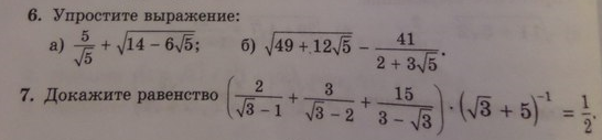 б)√(2+3√5)²-41(2-3√5)/(2+3√5)(2-3√5)=(2+3√5)-41(2-3√5)/(4-45)= (2+3√5)-41(2-3√5)(-41)=2+3√5+2-3√5=4