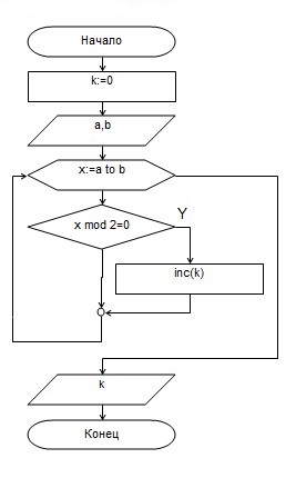 Составьте структурную схему алгоритма подсчитывающую количество чётных целых чисел в диапазоне от А до В.